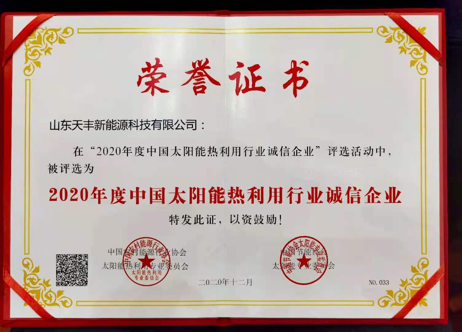 正是憑借良好的企業信用,創建優良精品工程的企業形象,天豐在市場不斷積攢良好的口碑。“中國太陽能熱利用行業誠信企業”榮譽證書的獲得,是行業對天豐始終堅持誠信經營的肯定。天豐將繼續以此為契機,通過加強信用、合同等管理,在互信互助、坦誠合作的基礎上不斷開拓進取,以質量促誠信,以誠信鑄未來!